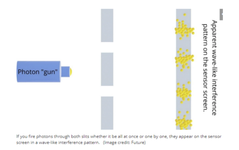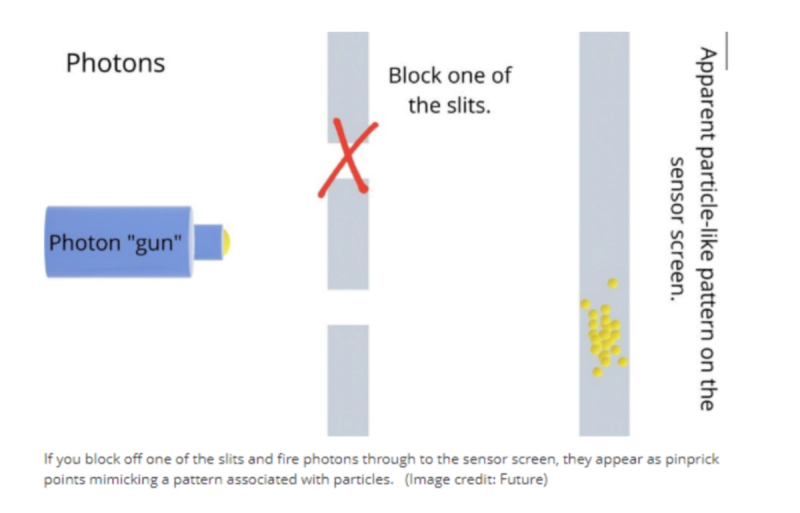 We will take into consideration that light is made of photons. By using photons instead of grains of sand we can carry out the double-slit experiment on an atomic scale. If you block one of the slits and fire protons to the sensor screen, you will see that the photons will end up in a line mostly in the same place the same pattern as the grains of sand. We could suggest that photons are particles.